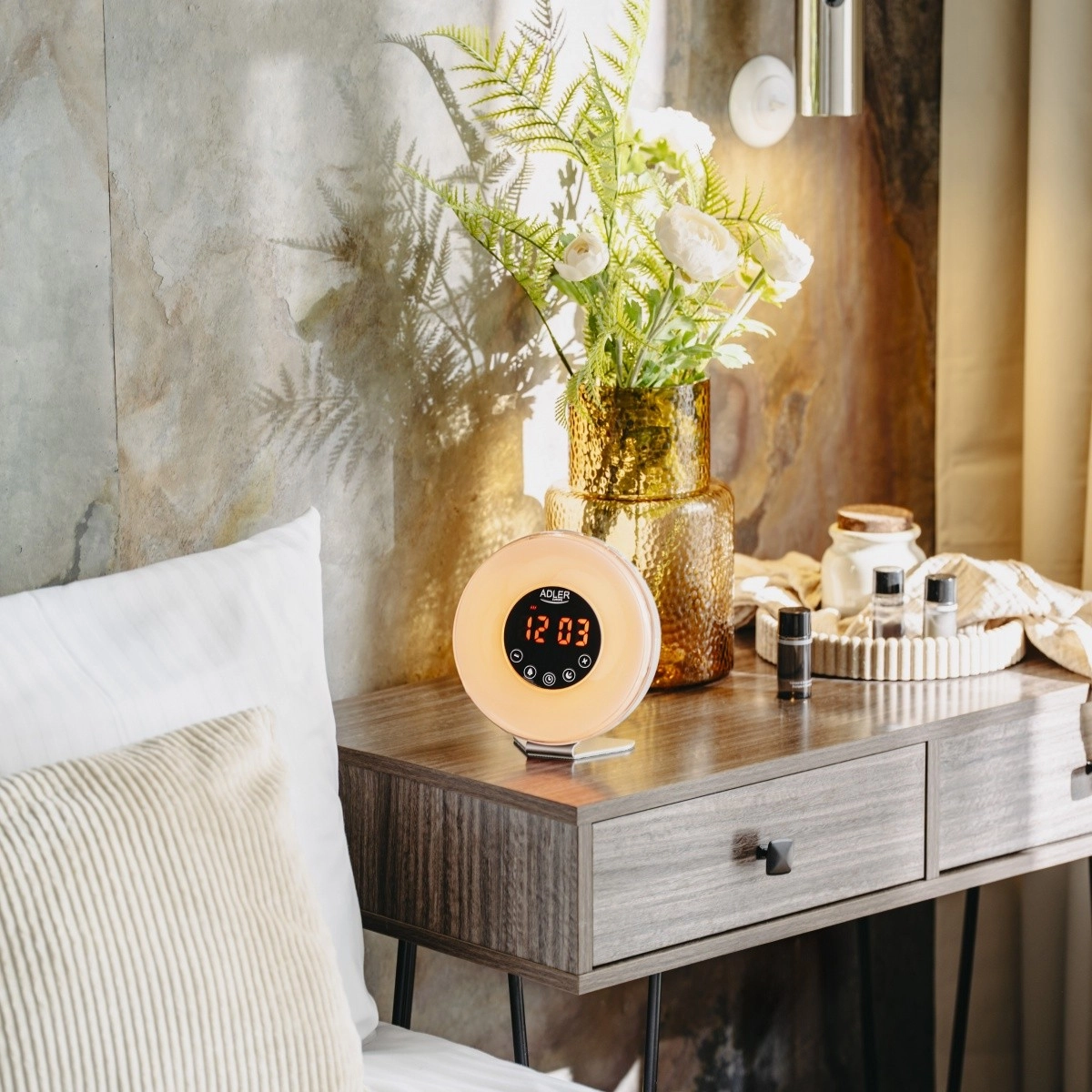 De wekker verhoogt het licht geleidelijk, zodat je zacht en zonder stress ontwaakt. Ondersteunt een gezond slaapritme en prettigere ochtenden.