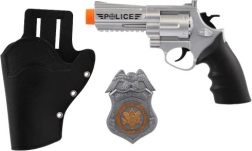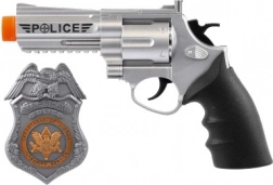 Politieset voor kinderen bevat een realistisch ogende plastic revolver, verwijzend naar de wereld van wetshandhaving en orde, aangevuld met een badge en holster voor een complete speelervaring.