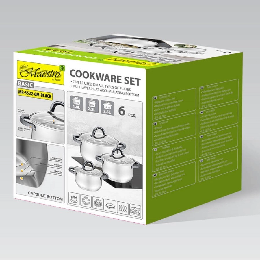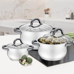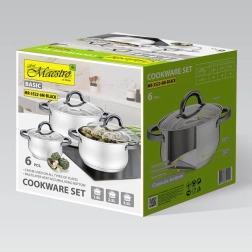 De MAESTRO pannenset is een praktische oplossing voor huishoudens die betrouwbaar kookgerei voor dagelijks gebruik willen. Roestvrij staal zorgt voor duurzaamheid, eenvoudig onderhoud en een gelijkmatige warmteverdeling, terwijl de zwarte ergonomische handgrepen een moderne uitstraling en een comfortabele grip bieden. Glazen deksels laten u het kookproces voortdurend in de gaten houden en helpen aroma en warmte beter vast te houden.