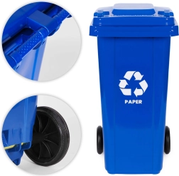 Praktische set van vier kleurgecodeerde containers met een inhoud van 4×120 l voor overzichtelijke afvalscheiding: papier, glas, plastic/metaal, restafval. Gemaakt van UV-bestendig HDPE, met rubberen wielen op een metalen as, ergonomische handgrepen en een sluitende deksel tegen regen en geurtjes. Antislipvoeten vergroten de stabiliteit. Geschikt voor huishoudens en bedrijven, compatibel met gemeentelijke systemen EN-840 en gecertificeerd volgens ISO9001/14001/45001.