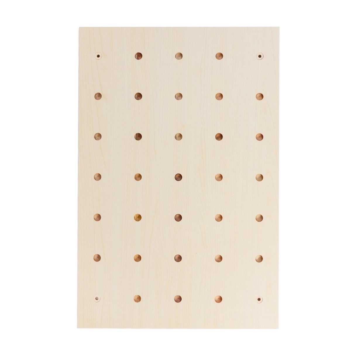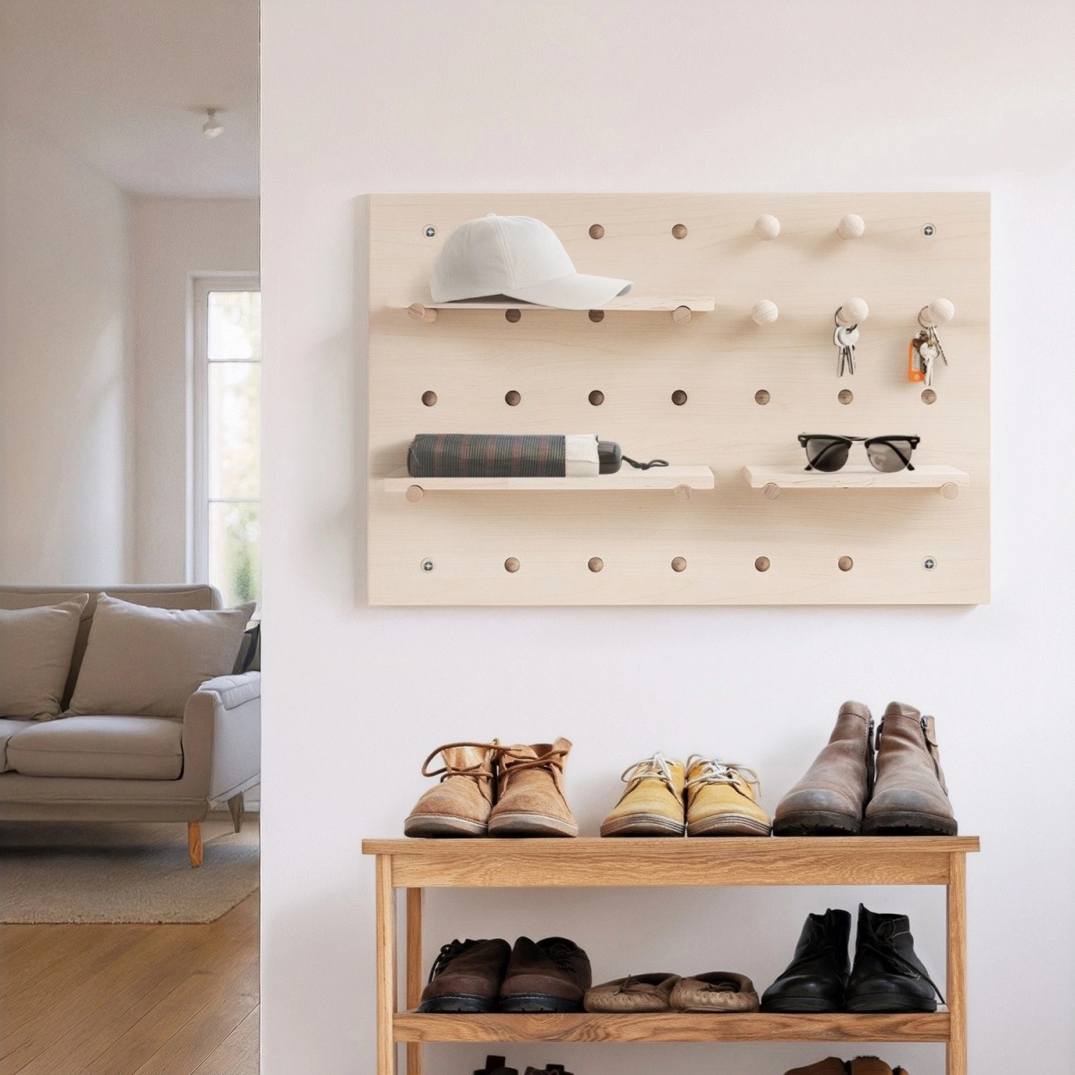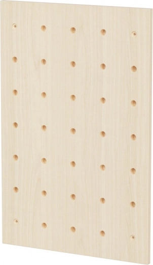 De MACLEAN wand-pegboard organizer in de afwerking licht hout verandert een vrije muur in overzichtelijke en stijlvolle opbergruimte. Het bord met een regelmatig gatenraster maakt vrije plaatsing van pennen, haken en planken mogelijk, zodat je gemakkelijk plek creëert voor sleutels, brillen, koptelefoons, kantoorspullen, decoraties of klein gereedschap.