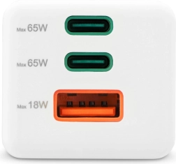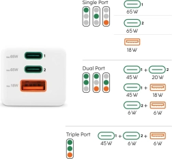 - USB‑C1: 65 W; USB‑C2: 65 W; USB‑A: 18 W