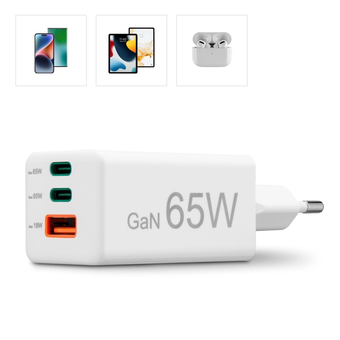 Moderne GaN‑chips zorgen voor hoge efficiëntie, minder warmte en een compact formaat met een vermogen tot 65 W voor snel opladen van smartphones, tablets en laptops.