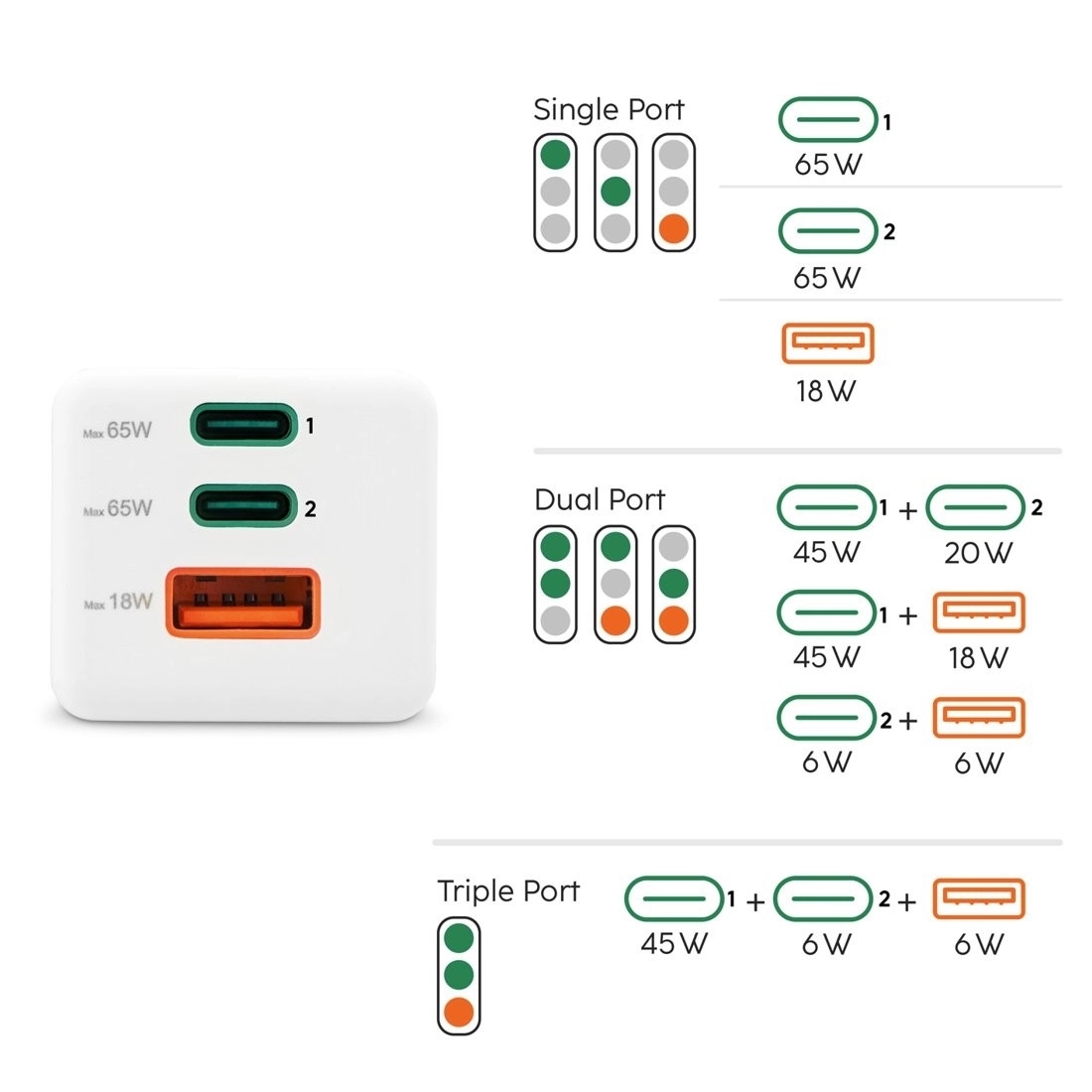 - USB‑C1 + USB‑C2 + USB‑A: 45 W + 6 W + 6 W