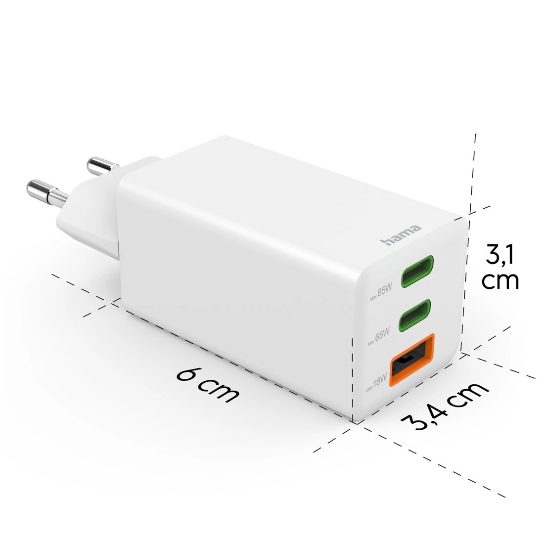 Compacte netlader van Hama met GaN-technologie en een vermogen van 65 W laadt telefoon, tablet en laptop snel op. Ondersteunt Power Delivery en Quick Charge, heeft 2× USB‑C + 1× USB‑A voor het gelijktijdig opladen van drie apparaten. Biedt veilig opladen, slimme stroomregeling en tot 60% in 30 minuten bij compatibele telefoons.