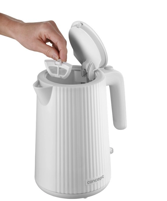 Voor een lange levensduur en veiligheid is de waterkoker uitgerust met de hoogwaardige Britse STRIX-connector. Het geïntegreerde verwarmingselement met een verborgen bodem vergemakkelijkt het schoonmaken en vermindert kalkaanslag. De praktische uitrusting omvat een knop voor eenvoudig openen van het deksel, een uitneembaar antikalkfilter en een 360° draaivoet met ruimte voor het opbergen van het netsnoer.