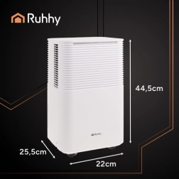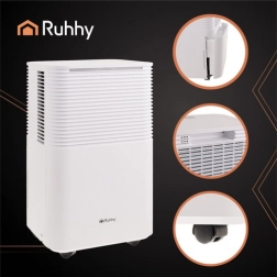 RUHHY DRYZIX is een condensatie‑ontvochtiger ontworpen voor efficiënte vochtopname met een capaciteit van 12 l/24 u. De geïntegreerde hygrometer en hygrostaat behouden het ingestelde vochtigheidsniveau, terwijl automatisch ontdooien de koelonderdelen tegen rijpvorming beschermt en een stabiele werking garandeert, ook bij lagere temperaturen.