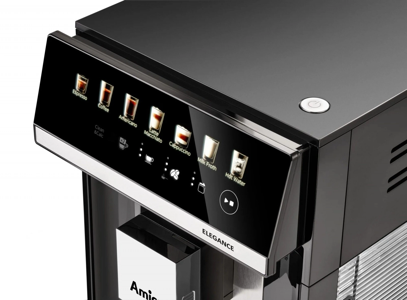 Het intuïtieve paneel met touch-iconen en LED-display vereenvoudigt de keuze van dranken, de instelling van sterkte en hoeveelheid koffie, en biedt toegang tot de functies HotWater en HotMilk.