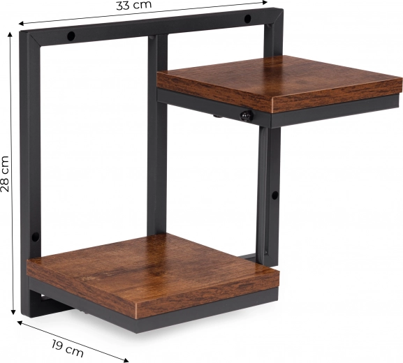 Verfraai je interieur met een praktische en moderne hangplank in loftstijl. Het minimalistische zwarte frame van poedergecoat staal en twee duurzame planken met houtdecor creëren een stijlvolle plek voor je planten, boeken of kleine decoraties. Dankzij de compacte afmetingen past hij in de woonkamer, keuken en badkamer.