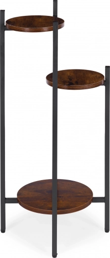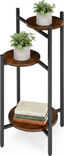 Stijlvolle drie-laagse plantenstandaard in industriële loftstijl combineert een stevige stalen constructie met planken in houtdecor. Dankzij de compacte afmetingen en de verticale indeling bespaart hij ruimte in de woonkamer, op kantoor en op het balkon, en biedt hij stabiliteit, anti-slip voetjes en een draagvermogen tot 15 kg.
