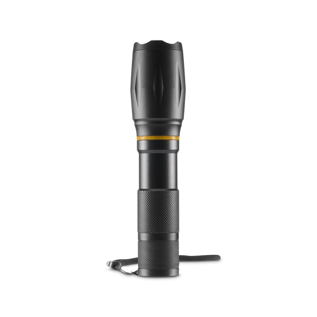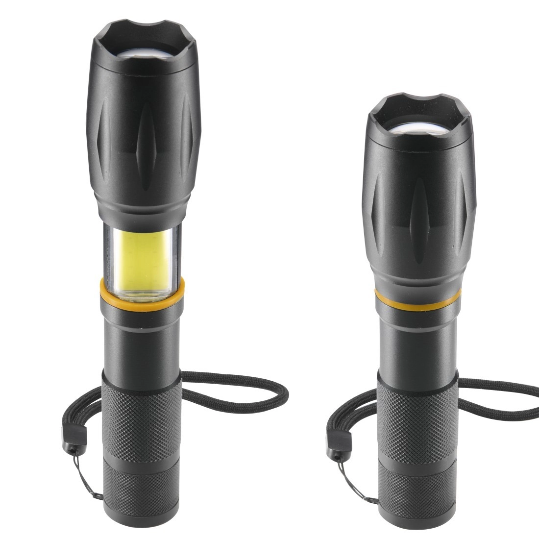 Deze veelzijdige zaklamp combineert een krachtige front-LED met een zijwaarts COB LED-paneel voor maximale flexibiliteit. Kies eenvoudig fel, gedimd of knipperlicht, terwijl de zoomlens je laat richten zoals nodig. De getextureerde behuizing met antislipafwerking en polsriem zorgen voor een stevige grip en comfortabel dragen.