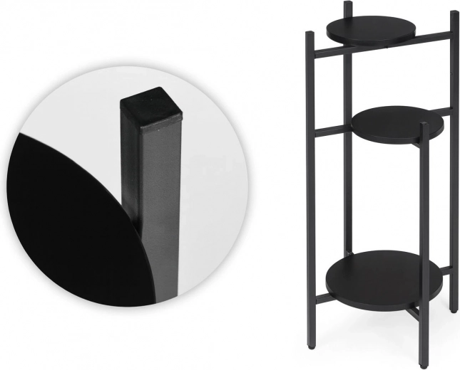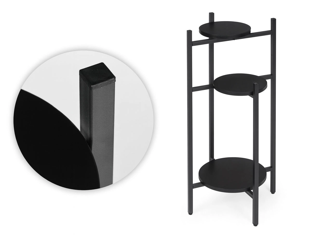 Elegante driedelige plantenstandaard van duurzame staal brengt meer groen en stijl in je huis of kantoor. Dankzij het moderne, minimalistische design, de compacte afmetingen en drie ronde legplanken benut hij de verticale ruimte optimaal. Poedergecoat metaal zorgt voor een lange levensduur, anti-slip voetjes beschermen de vloer en de draagkracht van 15 kg geeft zekerheid voor planten en decoraties.