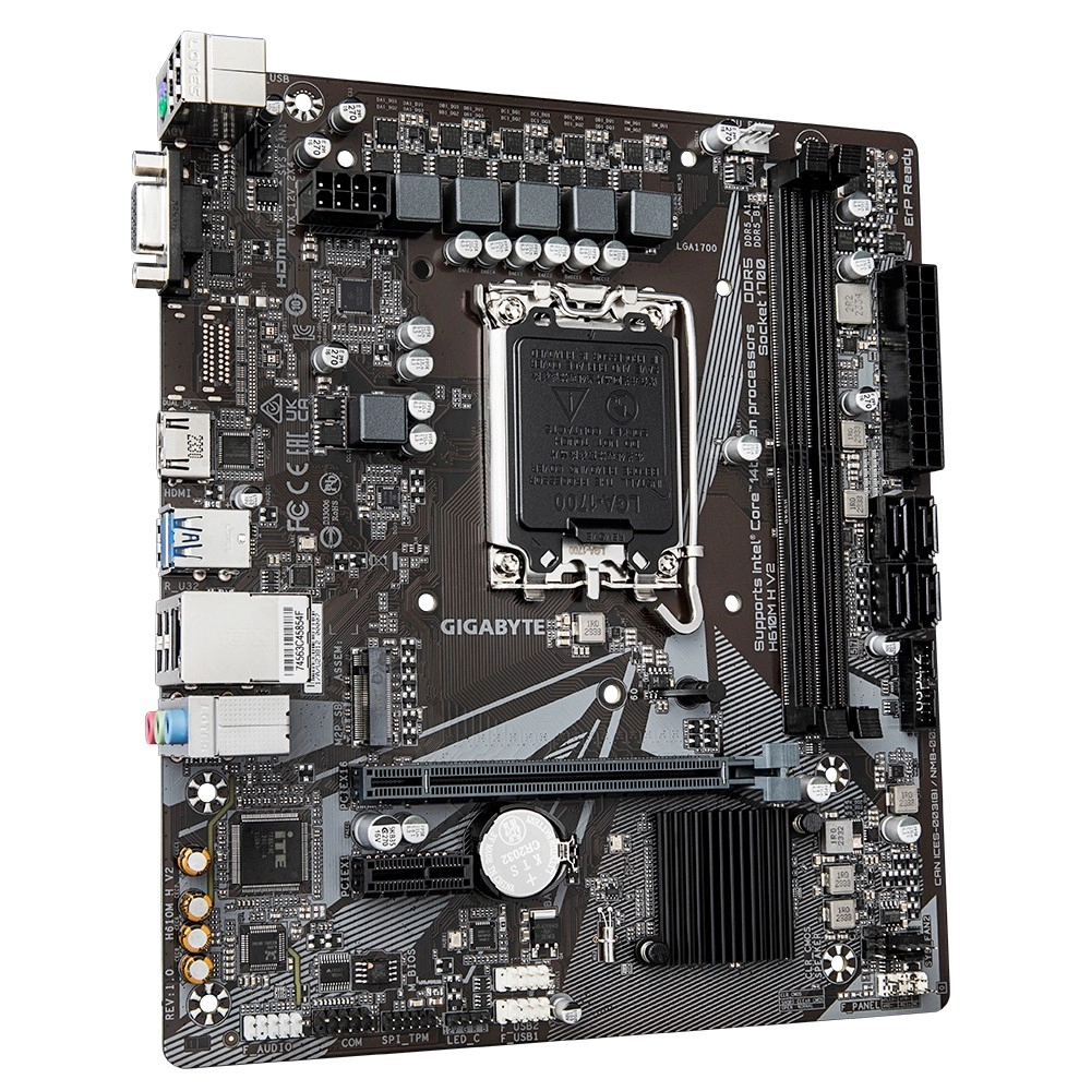 Bouw een betrouwbare pc voor werk en entertainment. Dit mATX-bord met Intel H610-chipset ondersteunt Intel Core-processors van de 12e, 13e en 14e generatie op socket LGA1700 en biedt moderne uitrusting in een compact formaat. Dankzij dual‑channel DDR5 en een NVMe M.2 (PCIe 3.0 x4)-slot bereik je vlotte systeemprestaties en snelle respons van apps.