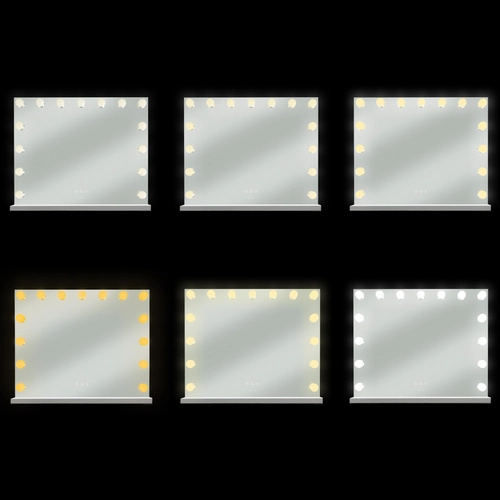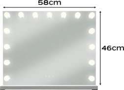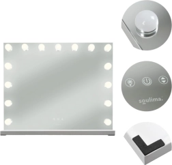 De elegante Soulima LED make-upspiegel 58 × 46 cm combineert HOLLYWOOD-stijl met professionele verlichting. 15 energiezuinige LED-lampen, een touchpanel met traploze helderheidsregeling en 3 lichtkleuren (warm, neutraal, koud) zorgen voor ideale omstandigheden voor make-up, huidverzorging en haarstyling. Dankzij het grote oppervlak, de mogelijkheid tot neerzetten of ophangen en dubbele voeding USB/230 V is het een praktische én stijlvolle toevoeging aan kaptafel of schoonheidssalon.
