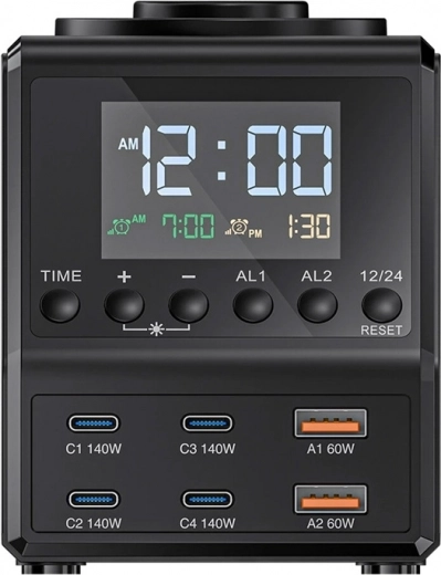 Stijlvolle wekker en krachtige oplaadstation in één. De BlitzWolf BW-FW10 biedt tot 240 W, 6 poorten (4× USB‑C, 2× USB‑A) en 2 draadloze zones (15 W voor telefoon, 5 W voor horloge). Ondersteunt snelladen PD 3.1, PPS en QC 4.0, kan laptops aan waaronder de MacBook Pro 16, en biedt dubbel alarm met een helder LED‑display. Inclusief meervoudige beveiliging voor veilig laden.