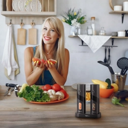 Ontdek het gemak van automatisch kruiden met één hand. Dit duo elektrische molens combineert modern design, precies malen en eenvoudig onderhoud. De transparante vensters tonen de resterende inhoud en het LED-licht verlicht bord of pan voor een nauwkeurige dosering.