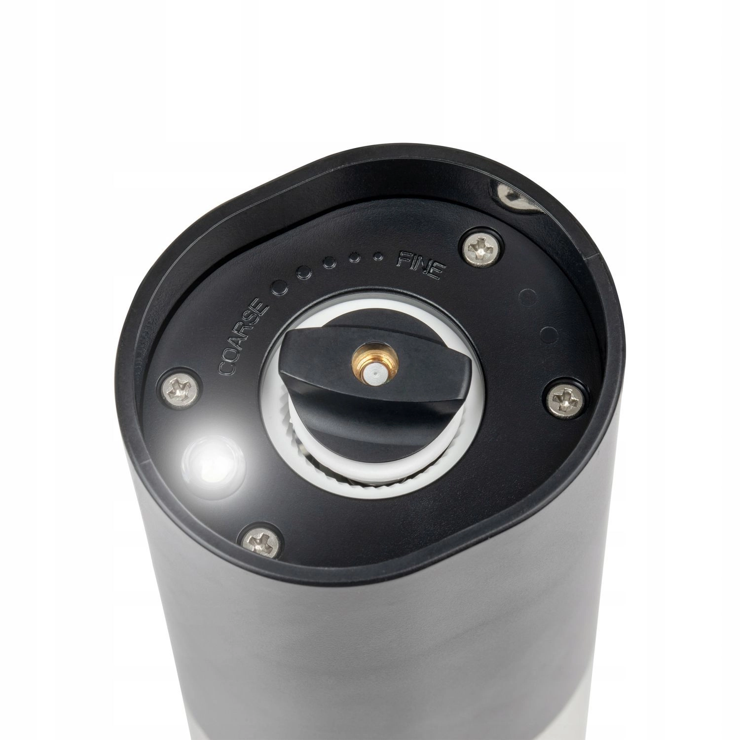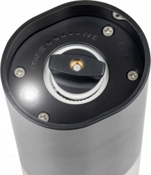 Met de onderste ring stel je de maalgraad traploos in, van fijn tot grof. Het geïntegreerde LED-licht verlicht bord of pan voor perfecte controle.