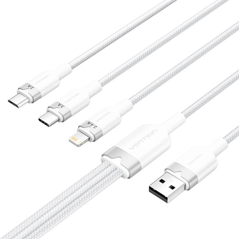 Zoek je één kabel voor al je apparaten? De Vention 3-in-1 combineert Lightning, USB‑C en Micro‑B, zodat je eenvoudig APPLE-, SAMSUNG-, XIAOMI-telefoons en oudere accessoires kunt opladen. Dankzij de max. stroom van 3 A en een vermogen tot 60 W voor USB‑C krijg je snel en veilig laden, terwijl 480 Mb/s zorgt voor vlotte synchronisatie van foto’s, muziek en documenten.