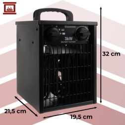 De elektrische verwarmingsunit KAMINER met een vermogen van 3000 W is ideaal voor thuis, kantoor, werkplaats en bouwplaats. Dankzij de sterke luchtstroom van 514 m³/h bereikt hij snel de gewenste temperatuur en houdt deze vast met behulp van de zelfherstellende thermostaat. De IPX4-bescherming zorgt voor veilig gebruik, ook in vochtigere omgevingen.
