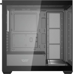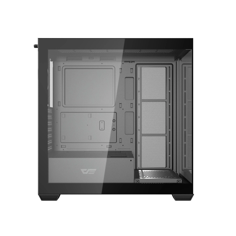 De Darkflash DS900W combineert een minimalistisch design met functionaliteit. Dubbelzijdig gehard glas biedt een 270° panoramisch zicht op de componenten en het ontbreken van een A‑stijl benadrukt de strakke uitstraling. De robuuste mechanische constructie zorgt voor hoge stabiliteit, ook voor zware grafische kaarten en krachtige koeling.