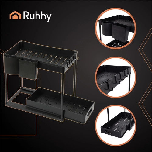 De praktische tweelaagse Ruhhy-organizer benut de ruimte onder de gootsteen, in de voorraadkast en in de badkamer optimaal. De uittrekbare planken zorgen ervoor dat je gemakkelijk bij schoonmaakmiddelen, sponsjes of cosmetica kunt zonder andere spullen te hoeven verplaatsen. Het stabiele metalen frame en hoogwaardig PP-plastic garanderen een lange levensduur, zelfs in een omgeving met verhoogde luchtvochtigheid.