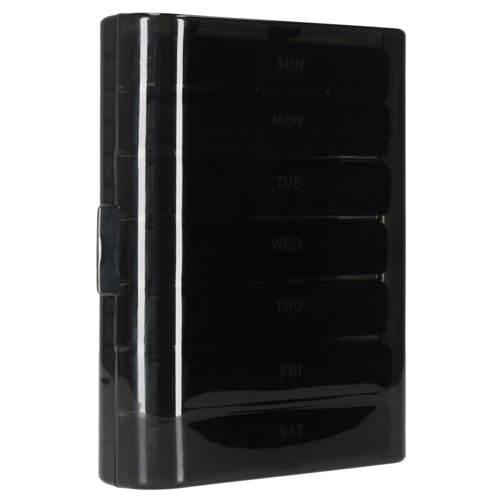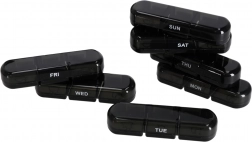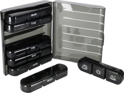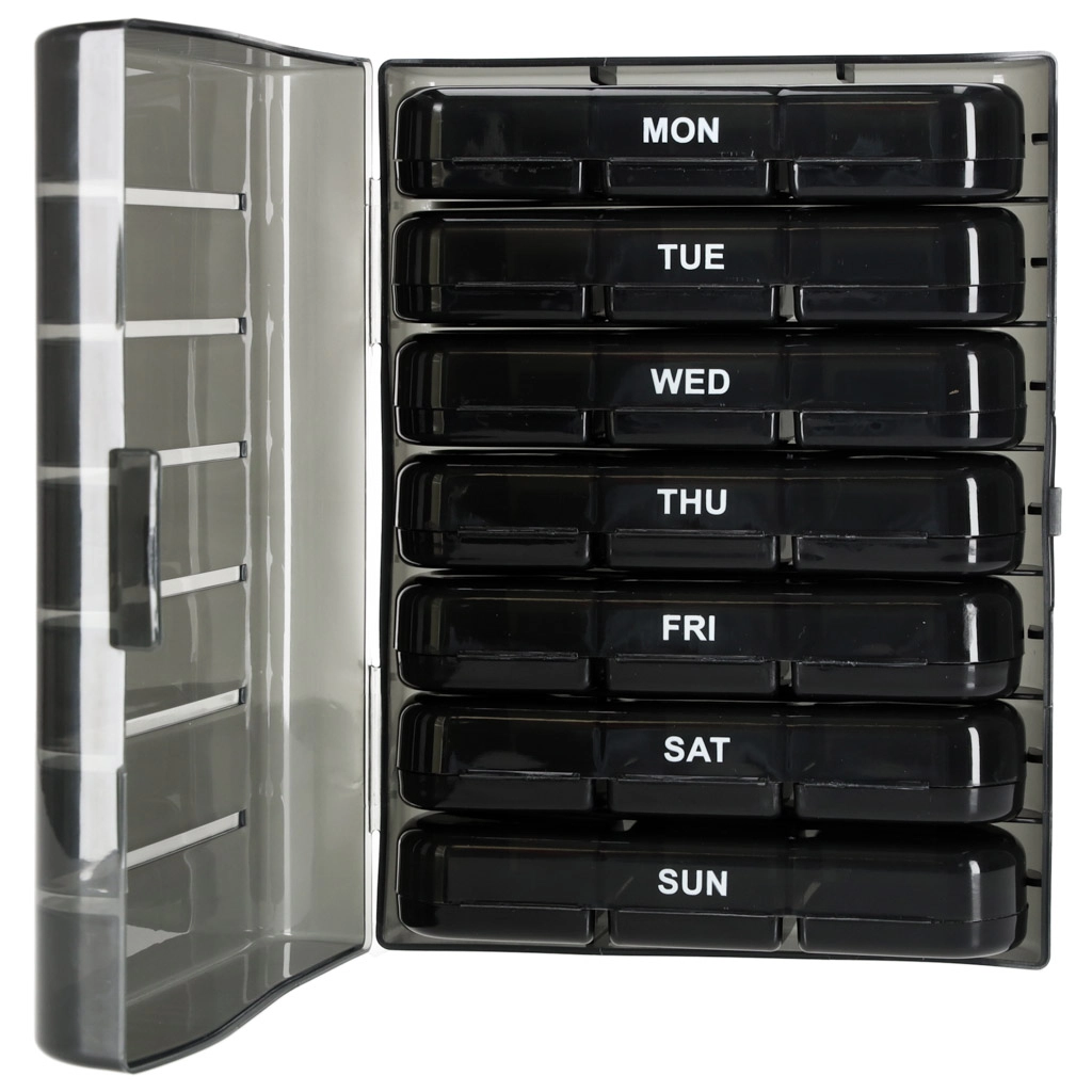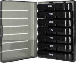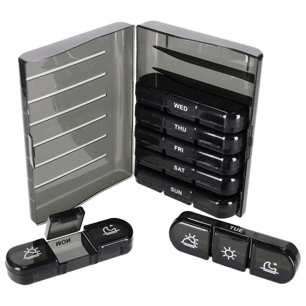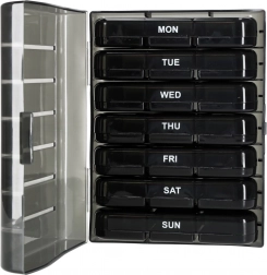 De moderne pillenorganizer helpt bij het dagelijks plannen van het innemen van tabletten en supplementen. De set bestaat uit 7 afzonderlijke dagcassettes met weekdagen (in het Engels) en pictogrammen voor de dagdelen. Elke cassette heeft afsluitbare compartimenten die morsen en vocht tegenhouden.