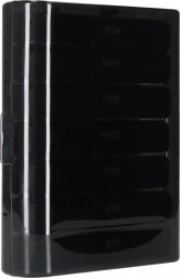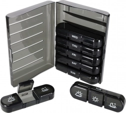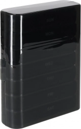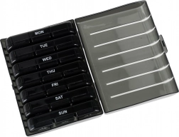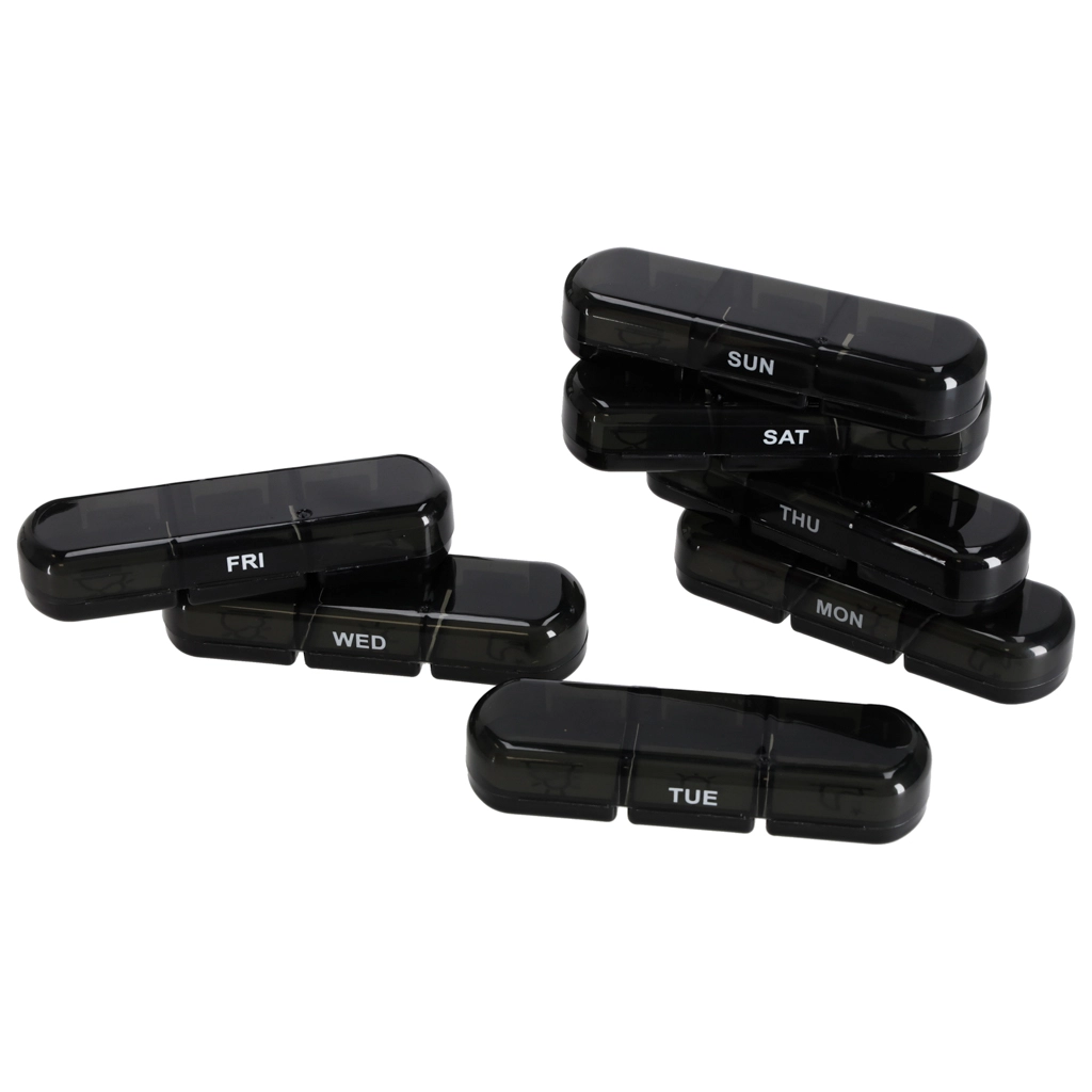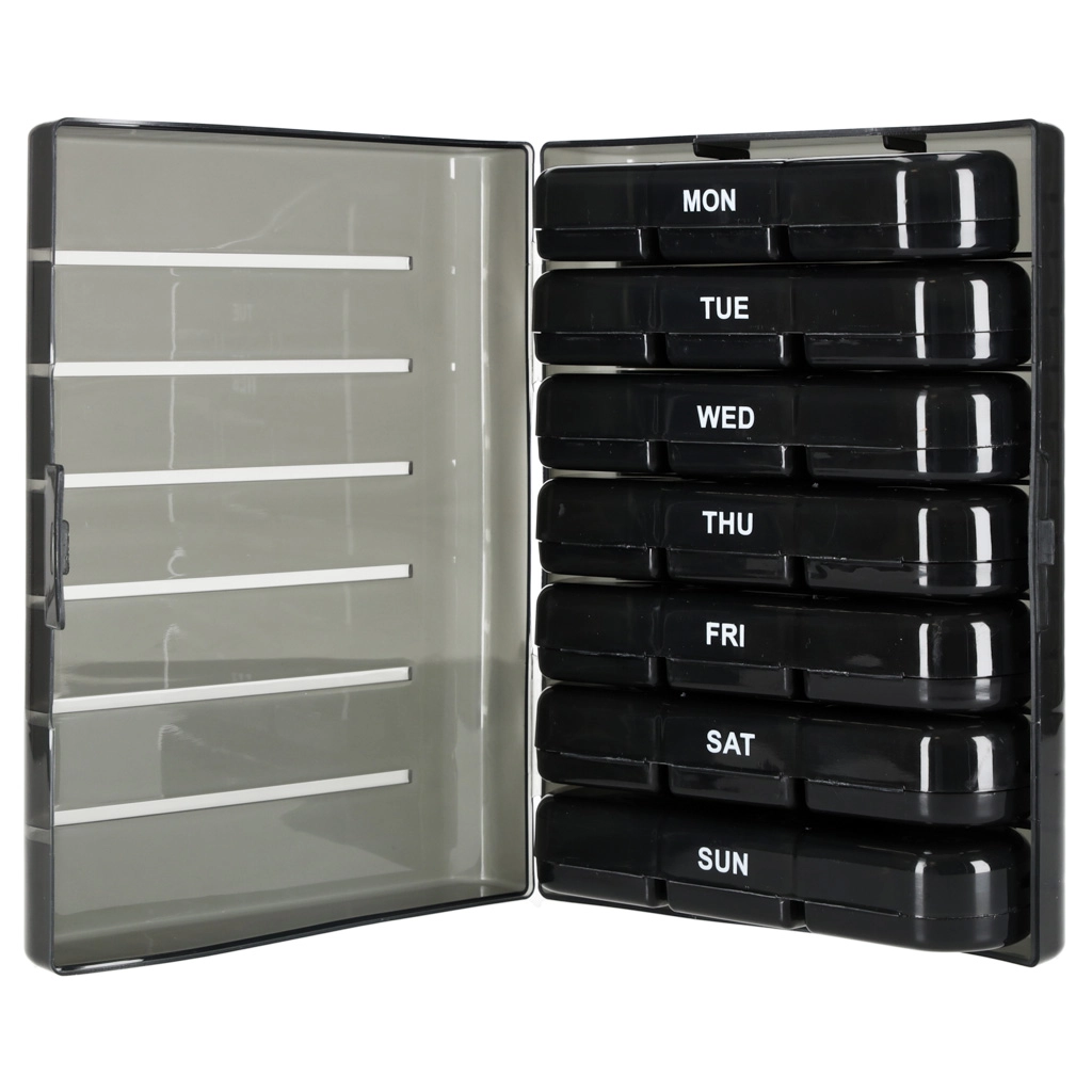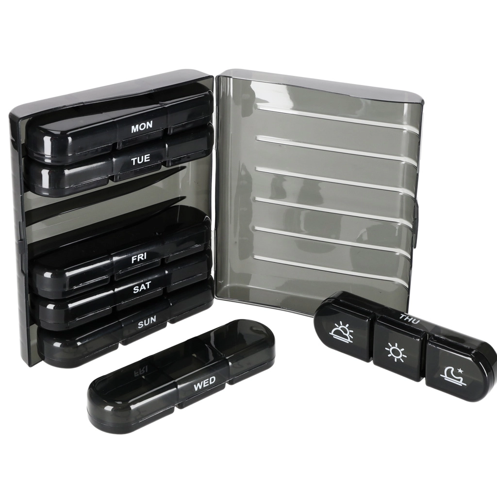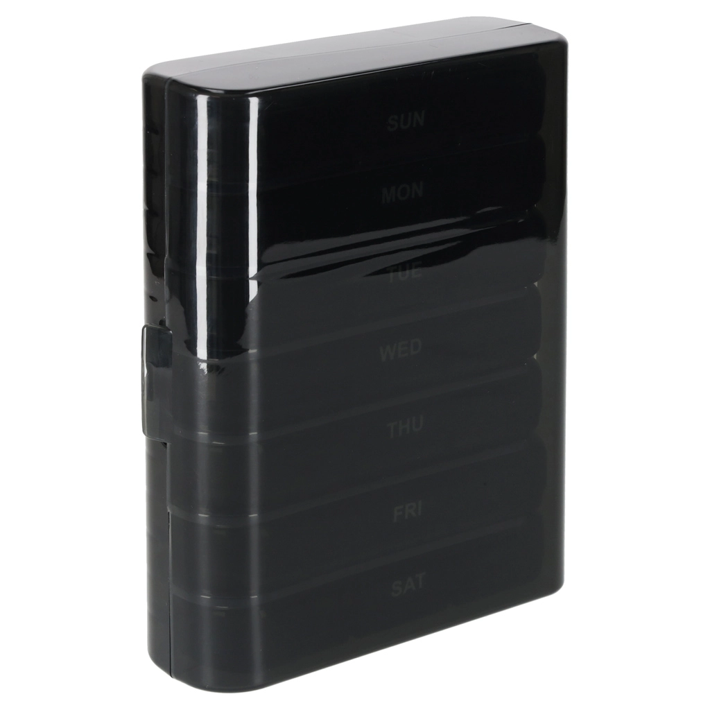 De moderne pillenorganizer helpt bij het dagelijks plannen van het innemen van tabletten en supplementen. De set bestaat uit 7 afzonderlijke dagcassettes met weekdagen (in het Engels) en pictogrammen voor de dagdelen. Elke cassette heeft afsluitbare compartimenten die morsen en vocht tegenhouden.