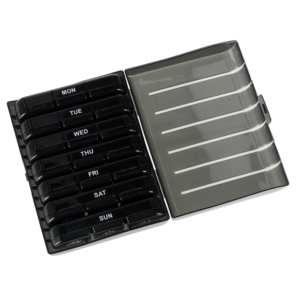 Zeven uitneembare modules met dagmarkering (MON–SUN) en dagdelen houden je doseringen overzichtelijk en foutloos.