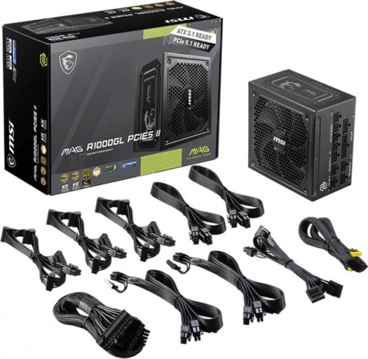 Krachtige en betrouwbare PC-voeding MAG A1000GL PCIE5 II met 1000 W vermogen, biedt 80 Plus Gold-certificering, volledig modulaire bekabeling met platte kabels en native PCIe CEM 5.1 voor moderne grafische kaarten. Compatibel met de ATX 3.1-specificatie, ondersteunt NVIDIA GeForce RTX serie 40 en zorgt voor stabiele werking dankzij geavanceerde beveiligingen en actieve PFC.