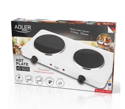 De compacte dubbele kookplaat ADLER AD 6520 met een vermogen van 2500 W is ideaal voor kleine keukens, vakantiewoningen, kantoren en studentenkamers. Hij biedt twee kookplaten van 185 mm en 155 mm, traploze 5‑standen temperatuurregeling, een duurzaam stalen behuizing, een controlelampje en stabiele rubberen pootjes voor veilig en comfortabel koken overal.
