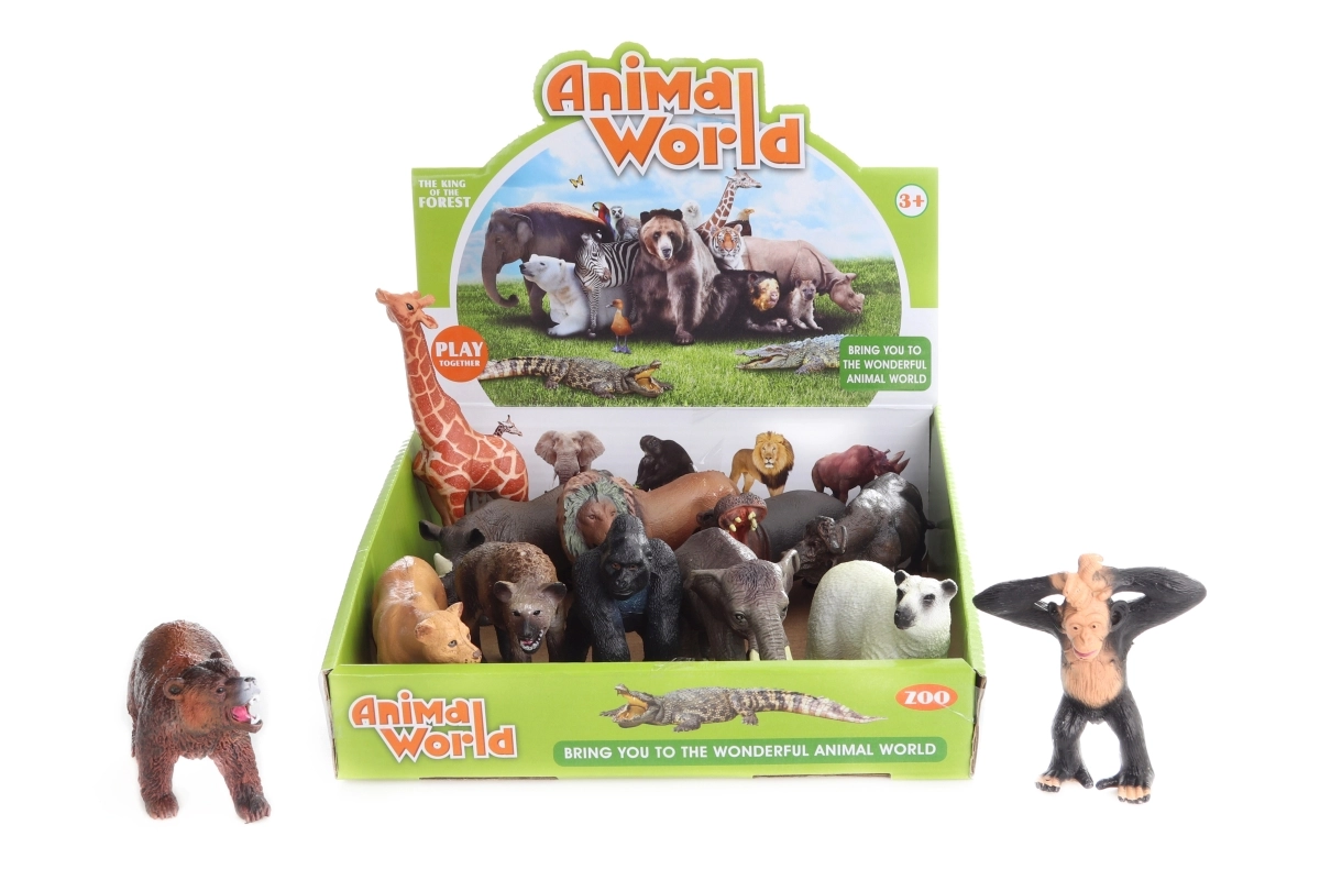 Deze uitgebreide set bevat 12 verschillende dieren: olifant, bizon, ijsbeer, hyena, gorilla, chimpansee, nijlpaard, bruine beer, leeuw, leeuwin, neushoorn en giraffe. Elk figuurtje is ongeveer 9–12 cm groot en biedt fraaie details die de fantasie en natuurlijke nieuwsgierigheid van kinderen prikkelen.