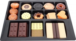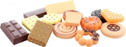 De set omvat een selectie lekkernijen – wafels, koekjes, chocolade en wafels – ideaal voor winkel- of keukenspel. De praktische verpakking in een cadeauverpakking maakt er een geweldig cadeau van voor kleine chefs.