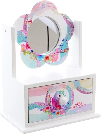 Het uittrekbare laadje met een eenhoornmotief houdt ringen, oorbellen en andere kleinigheden overzichtelijk en binnen handbereik.