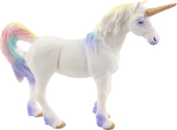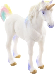 Deze elegante eenhoorn in wit met gouden hoorn en pastelkleurige regenboogmanen betovert met zijn realistische vormgeving en subtiele kleuraccenten. Perfect voor fantasierijk spel, verhalen vertellen en als decoratie voor de kinderkamer.