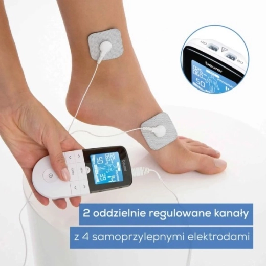 De multifunctionele elektrostimulator BEURER EM 49 combineert TENS voor pijnverlichting zonder medicatie, EMS voor training en spierherstel en ontspanningsmassage. Hij biedt 64 voorgeprogrammeerde programma’s en 6 gebruikersmodi met instelbare frequentie, pulsduratie en aan/uit-tijd. Dankzij 2 onafhankelijke kanalen, indicatie voor elektrodeplaatsing en de functie Favoriet programma is de bediening snel en intuïtief. Medisch hulpmiddel.