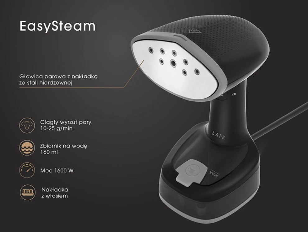 Lafe EasySteam is een praktisch alternatief voor een strijkijzer voor snel en zacht gladstrijken van kleding. Dankzij het vermogen van 1600 W en de stabiele stoomafgifte van 15–25 g/min pakt hij dagelijkse kreukels aan zonder delicate materialen te beschadigen. De roestvrijstalen kop verdeelt de stoom gelijkmatig voor een efficiënt resultaat.