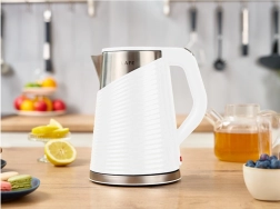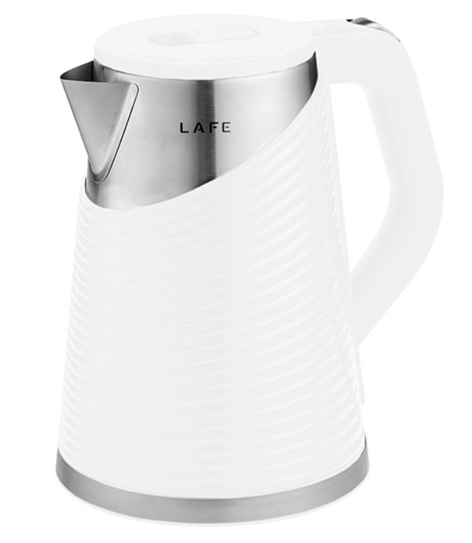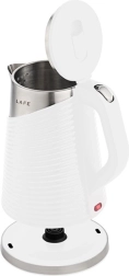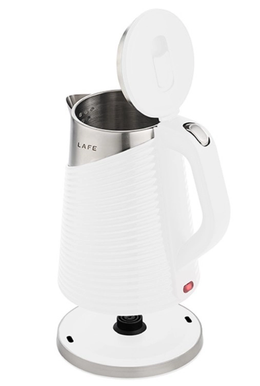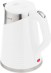 Stijlvolle en veilige waterkoker LAFE Elegant White biedt snelle verwarming van 1800 W, een dubbelwandige behuizing voor betere isolatie, een koel aanraakoppervlak (Cool Touch) voor veilig aanraken en een kalkfilter voor een zuivere smaak van dranken.