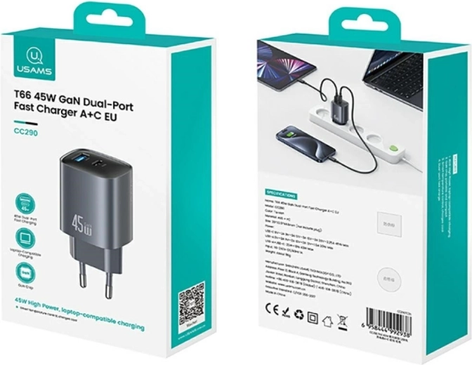 USAMS T66 met een vermogen van 45 W gebruikt moderne GaN-technologie voor hoge efficiëntie in een compact formaat. Eén USB‑C- en één USB‑A-poort maken snel opladen mogelijk voor een breed scala aan apparaten – van smartphones en tablets tot compatibele laptops met USB‑C‑voeding.