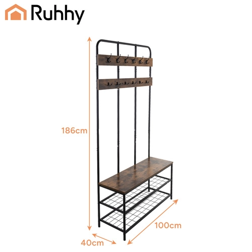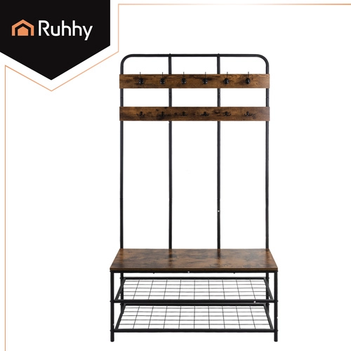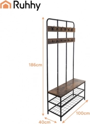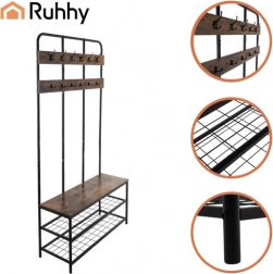 Maak van je hal een overzichtelijke en stijlvolle ruimte. Dit multifunctionele RUHHY-rek biedt slimme opslag voor schoenen, bovenkleding en accessoires. Het robuuste stalen frame met poedercoating en het MDF-blad in warm houtdecor zorgen voor een lange levensduur, stabiliteit en comfort bij het aan- en uittrekken van schoenen.