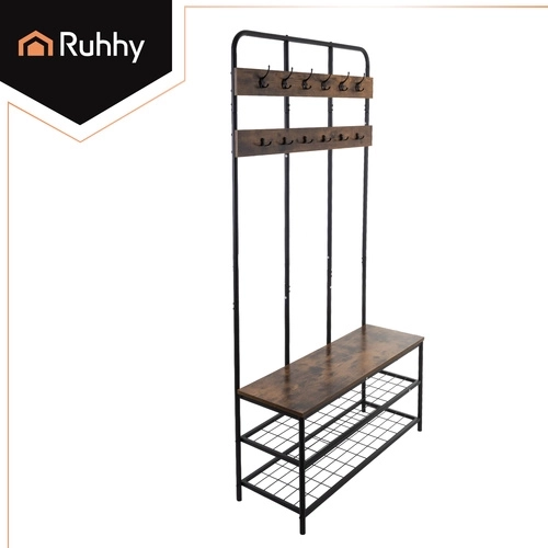 Elegante en praktische halrek RUHHY combineert een stabiele metalen constructie, twee ruime schoenenplanken, een comfortabele zitting en 12 dubbele haken voor maximale orde. De stijlvolle loft-look met houtdecor past in zowel moderne als klassieke interieurs en dankzij de snelle montage is alles binnen enkele minuten klaar.