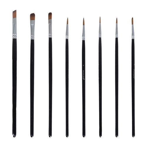 Set van 10 penselen (vlak en rond) en een licht kunststof palet met kuipjes en duimgat voor comfortabel mengen en detailwerk.