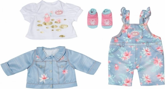 De set bevat een wit T-shirt met goudkleurig motief, een lichtblauw denim jasje, blauwe denim tuinbroek met bloemendessin en zachte sokken/pantoffeltjes. Alles past perfect op poppen van 43 cm.