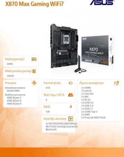 De ASUS X870 Max Gaming WiFi 7 is een high-end gamingmoederbord voor het AM5-platform dat het volledige potentieel van AMD Ryzen 9000-processors ontgrendelt. Het combineert een stabiele vermogensregeling, massieve VRM- en M.2-heatsinks met moderne connectiviteit, waaronder Wi‑Fi 7 en USB‑C, om snelheid, stabiliteit en bandbreedte te leveren voor gaming, contentcreatie en AI-workflows.