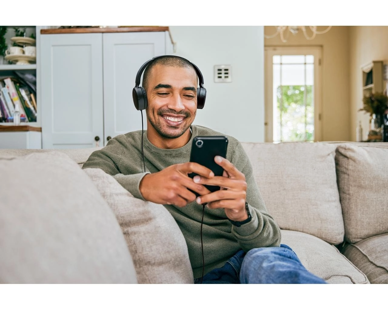 De intuïtieve bedieningsmodule op de kabel met volumeknoppen, een multifunctionele middelste knop en een schuifschakelaar maakt het beheren van gesprekken en media eenvoudig. Het platte, opvouwbare design bespaart ruimte in je tas en staat stijlvol op je bureau en in je thuissituatie.