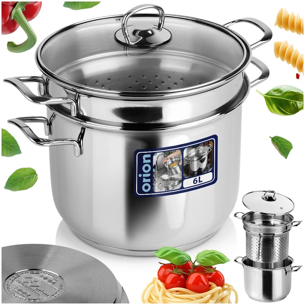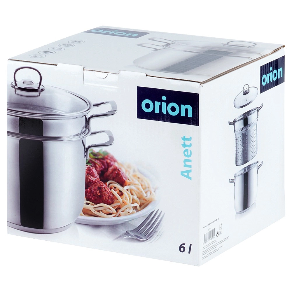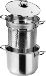 Ontdek de veelzijdige 3-delige set ANETT: een ruime pan van 6 l, een geperforeerde inzet voor koken en afgieten, en een glazen deksel met een stoomuitlaat. De robuuste constructie van gepolijst roestvrij staal is duurzaam, gemakkelijk te reinigen en staat prachtig in een moderne keuken. Met de inzet kook en giet je pasta of groenten af zonder een extra vergiet.