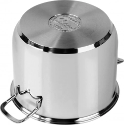 De meerlaagse akutermische bodem verdeelt de warmte efficiënt en slaat deze op voor energiebesparend koken op alle soorten kookplaten, inclusief inductie.