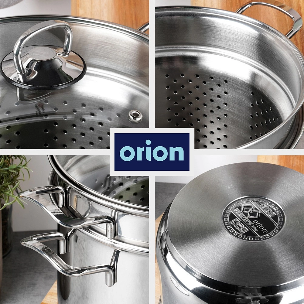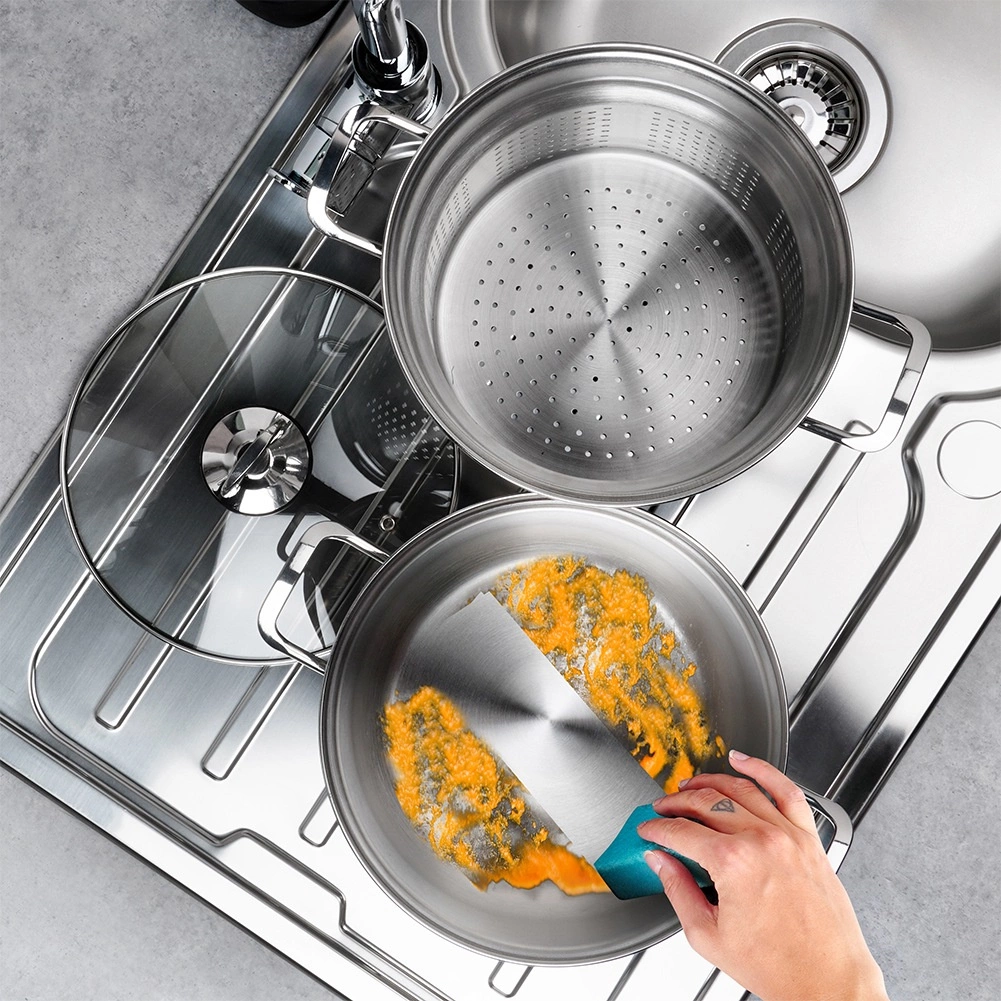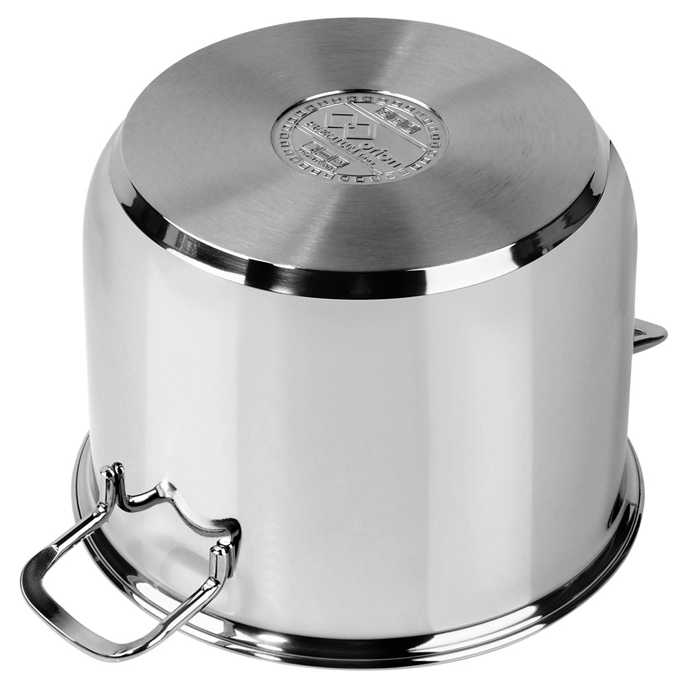 Gepolijst roestvrij staal is hygiënisch en corrosiebestendig. De set is vaatwasserbestendig en de handgrepen zorgen voor veilige hantering.