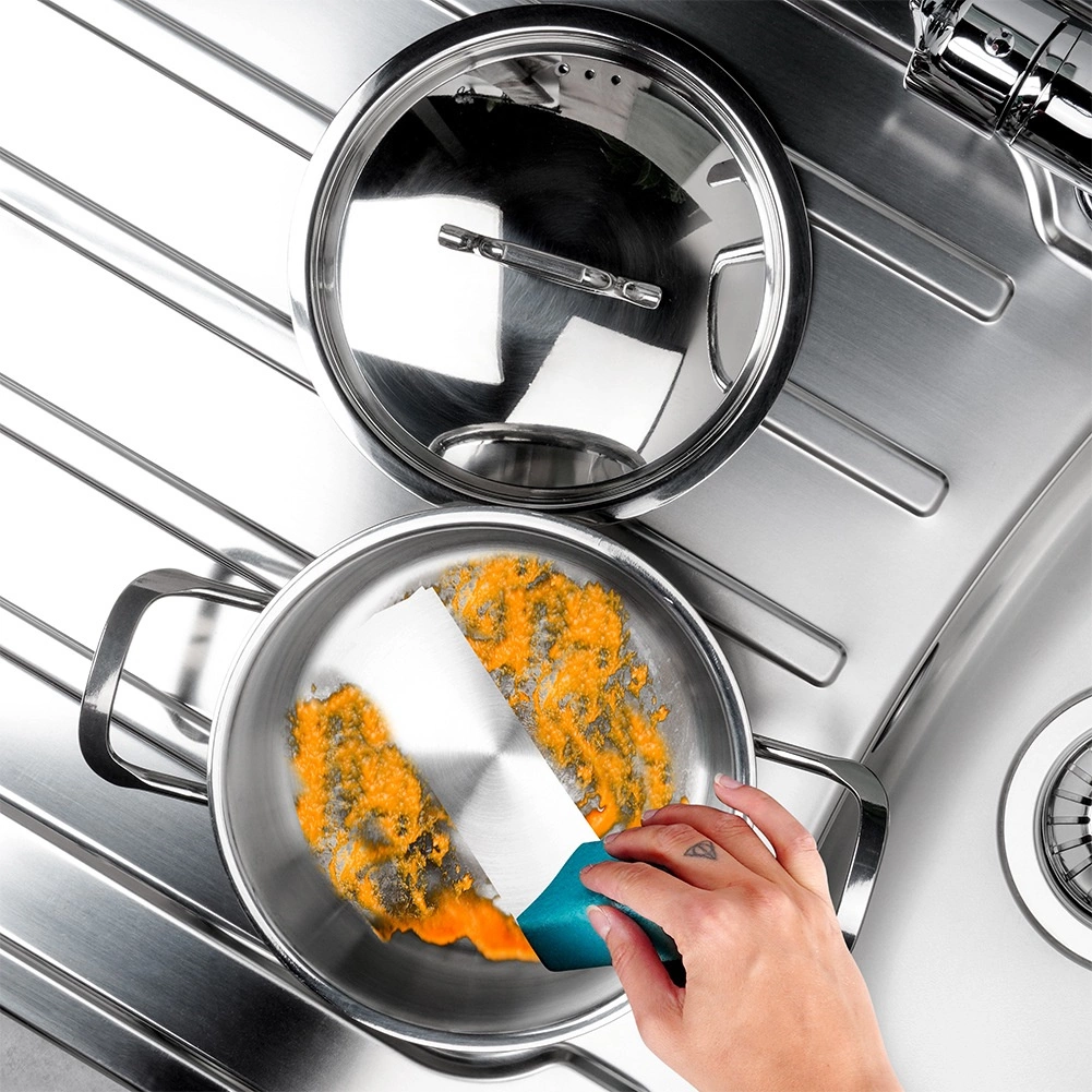 De robuuste sandwichbodem slaat warmte uitstekend op en verdeelt deze gelijkmatig, wat de kooktijd verkort en energie bespaart op alle soorten kookplaten, inclusief inductie.