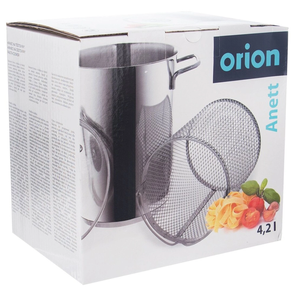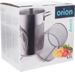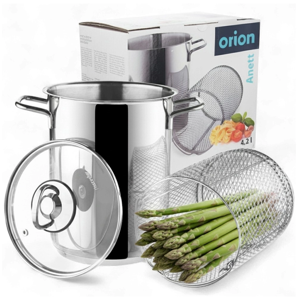 De roestvrijstalen mand met praktische handgreep maakt het mogelijk om asperges of pasta in te leggen en na het koken veilig en snel direct uit de pan af te gieten.