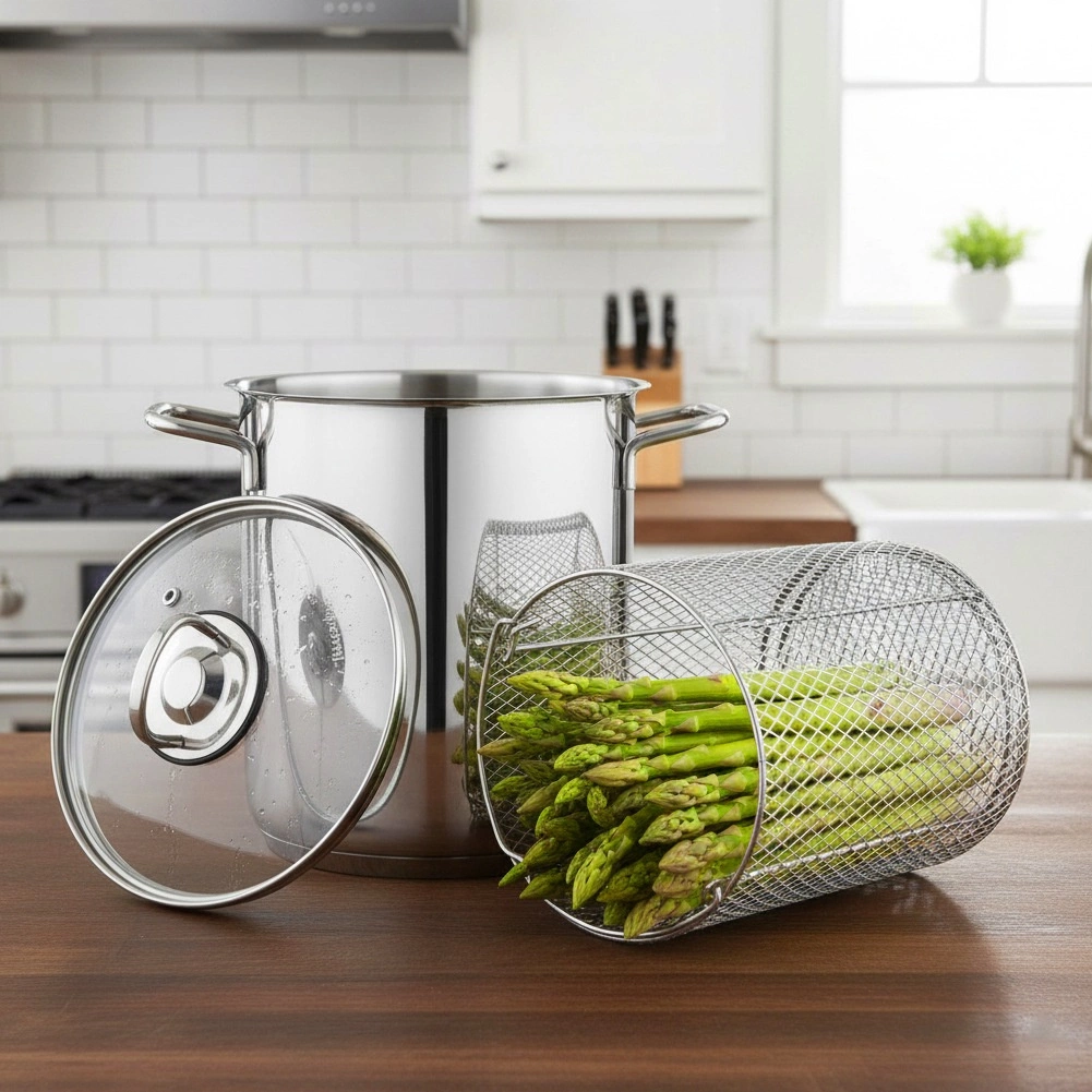 De hoge vorm en de inzetmand zijn perfect voor het koken van asperges, spaghetti, rijst en voor het blancheren van groenten en fruit.
